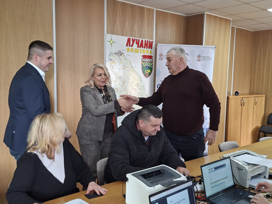 Ministarka građevinarstva, saobraćaja i infrastrukture Aleksandra Sofronijević posetila je danas u opštini Lučani šaltere za upis prava svojine nad objektima, predviđene zakonom "Svoj na svome".