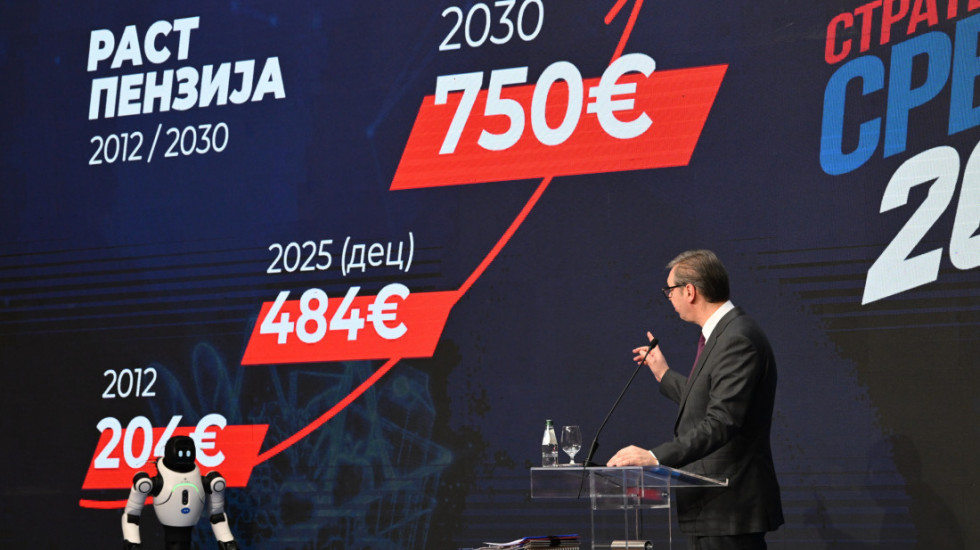 "Prosečna plate u 2012. je bila 366 evra, a u decembru 2025. bila je 1.057 evra. Prema našim procenama, prosečna plata će biti 1.700 evra 2035. godine, a 2030. biće negde 1.320 evra", rekao je Vučić.