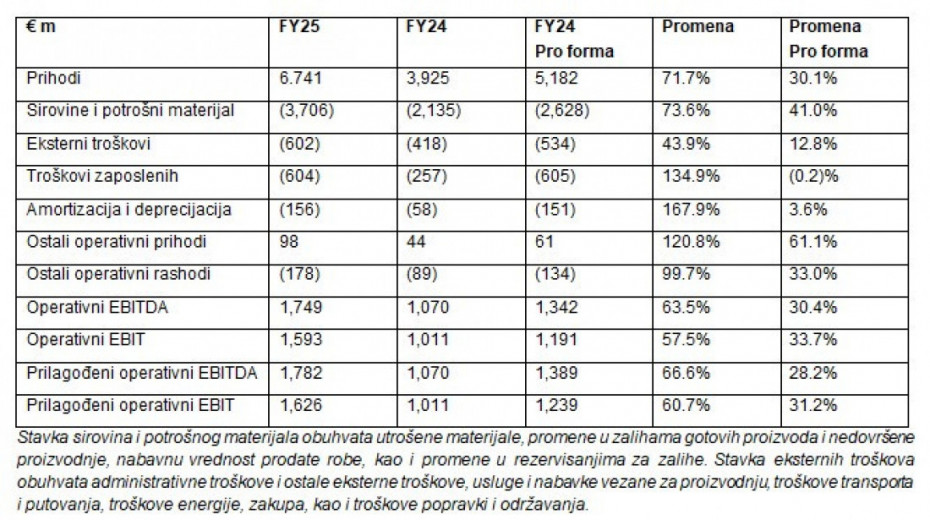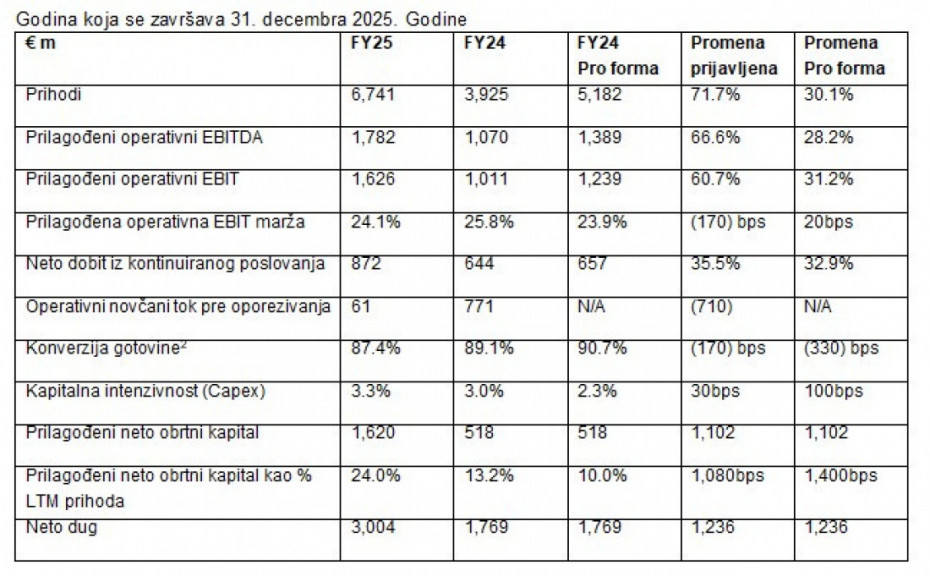 2 Ovo saopštenje uključuje određene alternativne mere učinka (APM) koje nisu definisane niti propisane prema Međunarodnim standardima finansijskog izveštavanja (IFRS). Ove mere koristi menadžment kako bi pružio dodatni uvid u osnovne performanse poslovanja i unapredio uporedivost između izveštajnih perioda, prilagođavanjem za stavke koje mogu narušiti sliku o kontinuiranim operativnim performansama Grupe. Definicije APM mera korišćenih u ovom saopštenju date su u napomenama ovog izveštaja. Prilagođeni operativni EBIT se izračunava oduzimanjem nenovčanog uticaja od 32 miliona evra u fiskalnoj 2025. godini od povećanja fer vrednosti zaliha (alokacija kupovne cene) uključenog u operativne troškove (pro forma za fiskalnu 2024. godinu: 47 miliona evra). Pro forma operativni EBIT za fiskalne 2025. i 2024. godinu prilagođen je za €32m, odnosno €47m. Konverzija gotovine označava prilagođeni operativni EBITDA umanjen za CAPEX, podeljen prilagođenim operativnim EBITDA. Operativni novčani tok pre oporezivanja označava prilagođeni operativni EBITDA, umanjen za promenu u obrtnom kapitalu i za Capex. Prilagođeni neto obrtni kapital za 3FY 2025 ne uključuje potraživanje od €275 mil koje se odnosi na optimizaciju strukture Grupe (izdvajanje neosnovnih aktivnosti).