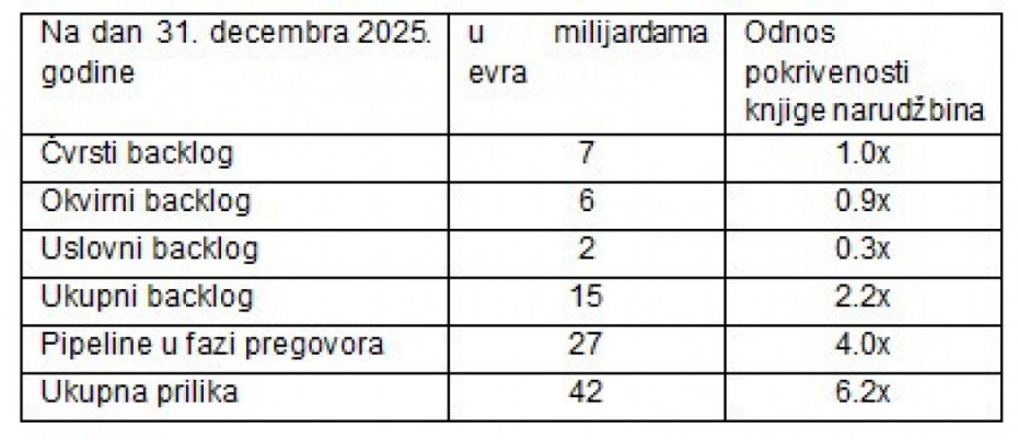 Grupa klasifikuje narudžbine u backlogu kao narudžbine iz potpisanih i važećih ugovora, dugoročnih okvirnih sporazuma i ugovora koji još nisu u potpunosti finalizovani i stupili na snagu, ali se na osnovu prethodnog iskustva i prirode pregovora smatraju gotovo izvesnim i uključuju u prognoze. Višeslojni backlog Grupe, koji obuhvata čvrsti (potpisani i važeći), okvirni (dugoročni okvirni sporazumi za koje će se konkretni uslovi realizacije definisati u kasnijim fazama) i uslovni backlog (ugovori koji još nisu u potpunosti finalizovani i stupili na snagu, ali se na osnovu prethodnog iskustva i prirode pregovora uzimaju u obzir), obezbeđuje visoku vidljivost prihoda, uz istorijski visoke stope konverzije iz uslovnog u okvirni i čvrsti backlog, što potvrđuje pouzdanost backloga kao pokazatelja budućih prihoda.