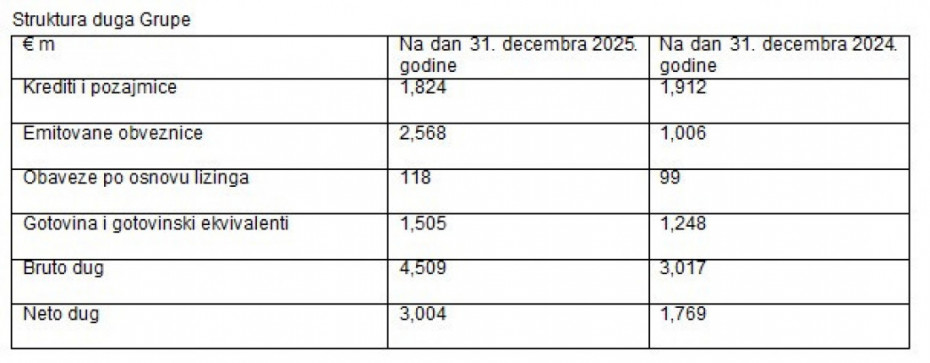 Neto dug iznosio je €3,004miliona na kraju godine, uz odnos neto duga i LTM prilagođenog operativnog EBITDA od 1.7x u skladu sa smernicama ispod 1.8x objavljenim prilikom IPO-a. Ovaj nivo zaduženosti odražava snažnu generaciju gotovine Grupe tokom godine i disciplinovana kapitalna ulaganja.