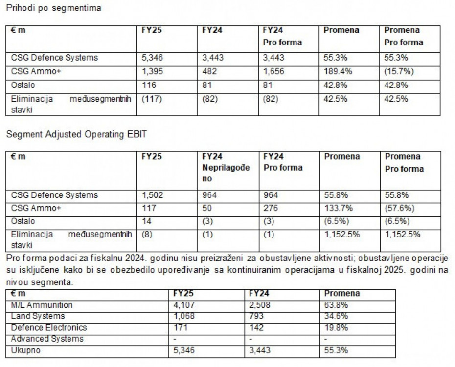 Prilagođeni operativni EBIT porastao je za 60.7% na €1.6bn, uz stabilne marže od 24.1%, u skladu sa rasponom projekcija navedenim prilikom IPO-a. Marže su posebno imale koristi od efekata obima u segmentu municije srednjeg i velikog kalibra i disciplinovane kontrole troškova, delimično neutralisane višim ulaznim troškovima i troškovima integracije. Neto dobit iz kontinuiranih operacija porasla je na €872 miliona, odražavajući veći operativni profit, delimično umanjen povećanim troškovima finansiranja.