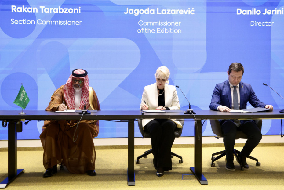 U Beogradu je potpisan Ugovor o učešću Saudijske Arabije na međunarodnoj specijalizovanoj izložbi Ecpo 2027, a ugovor su potpisali komesar Expo i ministarka unutrašnje i spoljne trgovine Jagoda Lazarević, direktor kompanije Ecpo 2027 Danilo Jerinić i komesar sekcije Kraljevine Saudijske Arabije za Expo 2027 Rakan Tarabzoni.