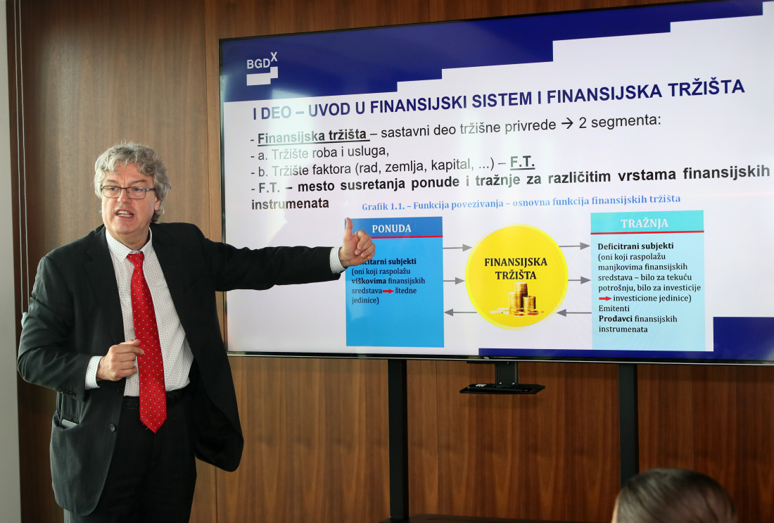 Profesor Dejan Erić je učesnicima predstavio osnove funkcionisanja finansijskog sistema i tržišta kapitala, sa posebnim fokusom na ulogu berze kao specifičnog oblika organizovanog tržišta.