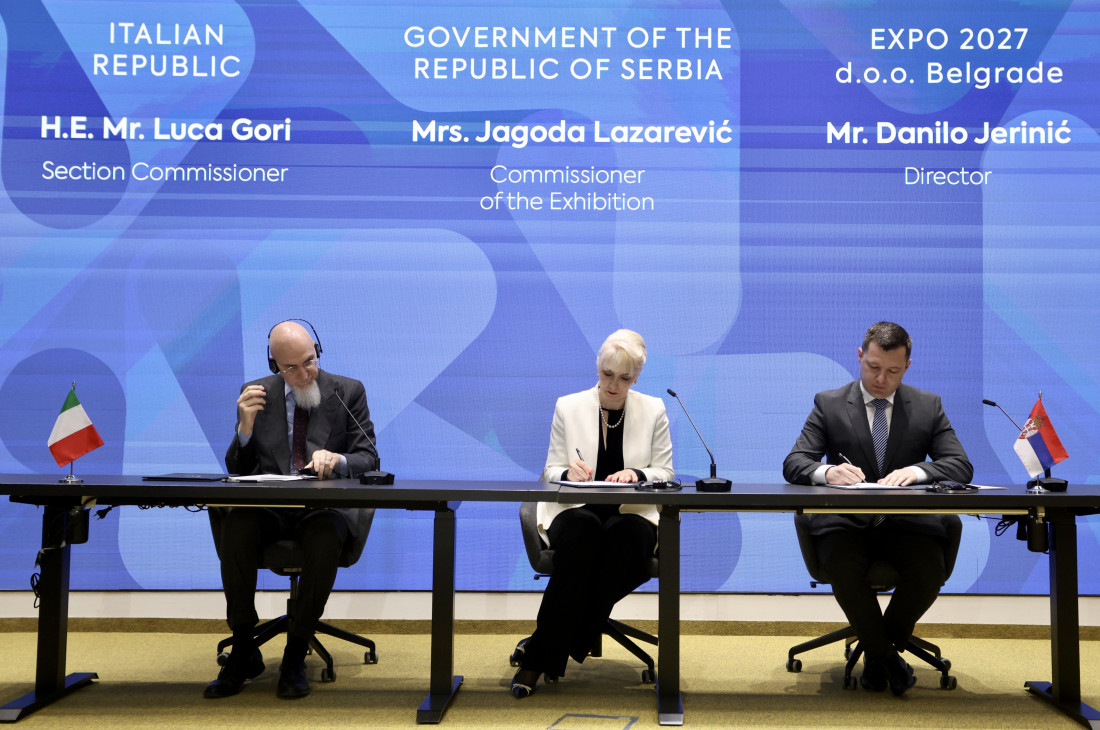 U Beogradu je danas potpisan ugovor o učešću Italije na specijalizovanoj izložbi Ekspo 2027 Beograd, a ministarka unutrašnje i spoljne trgovine Jagoda Lazarević izjavila je da je Italija jedan od najznačajnijih ekonomskih partnera Srbije, kao i da je italijansko učešće na izložbi Ekspo 2027 u Beogradu važno. Ministarka očekuje da će paviljon Italije na izložbi biti "živ i zanimljiv".