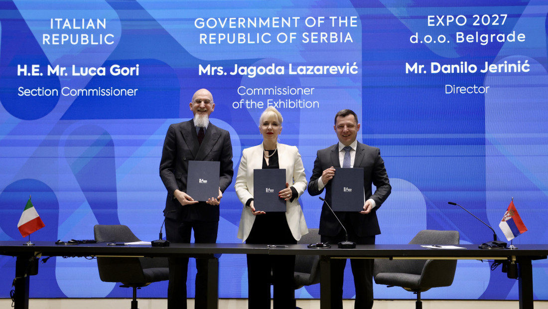 Ugovor su potpisali ministar unutrašnje i spoljne trgovine u Vladi Srbije i komesar za Ekspo 2027 Beograd Jagoda Lazarević, direktor kompanije Ekspo 2027 Beograd Danilo Jerinić i komesar sekcije Republike Italije za Ekspo 2027 Beograd Luka Gori. Lazarevićeva je, nakon potpisivanja ugovora u Ekspo Plejgraunudu na Beogradskom sajmu, rekla da Srbiju i Italiju decenijama povezuju izuzetno razvijeni, kako politički tako i ekonomski odnosi.