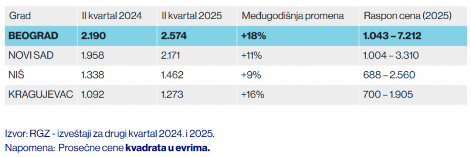 Dok su godinama novogradnje u Srbiji diktirale tempo rasta cena na tržištu nekretnina, u poslednje vreme ulogu tržišnog lidera preuzeli su stariji stanovi. Podaci Republičkog geodetskog zavoda (RGZ) pokazuju da je prosečna cena kvadrata starogradnje u drugom kvartalu 2025. porasla u svim većim gradovima: u Beogradu za 18 odsto, u Kragujevcu za oko 16 odsto, dok su Novi Sad i Niš zabeležili rast od 11, odnosno devet odsto, dok su cene stanova u gradnji sporije rasle.