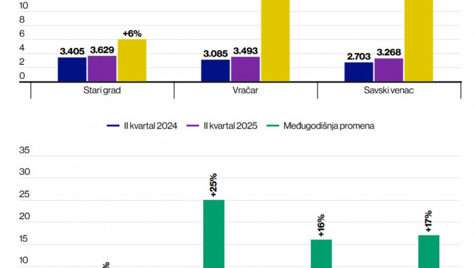 U Beogradu je prosečna cena kvadrata starogradnje dostigla 2.574 evra, a u najtraženijim opštinama poput Vračara i Savskog venca vrednosti su veće i do 25 odsto u odnosu na prošlu godinu. Kada je reč o saloncima na Dorćolu, Vračaru i oko Kalenić pijace, tu cene čak prelaze 4.000 evra po kvadratu, što je gotovo ravnopravno s novim luksuznim kompleksima. U Novom Sadu, prosečna cena kvadrata starih stanova iznosi 2.171 evra u drugom kvartalu.