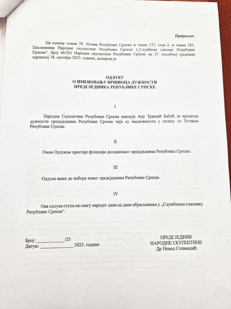 "Ovom odlukom prestaje funkcija dosadašnjeg predsednika Republike Srpske. Odluka važi do izbora novog predsednika Republike Srpske," stoji u zaključku.