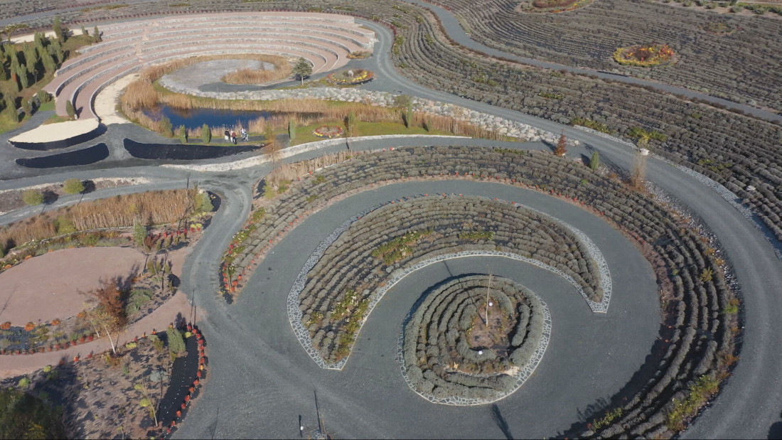 Park je ukrašen sa 130.000 sadnica lavande sa šest nijansi boja - od ljubičaste, plave, pa do roze i bele - koje formiraju šarene krugove i spirale, prepoznatljive iz ptičje perspektive.