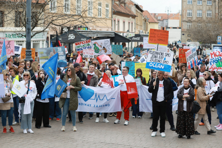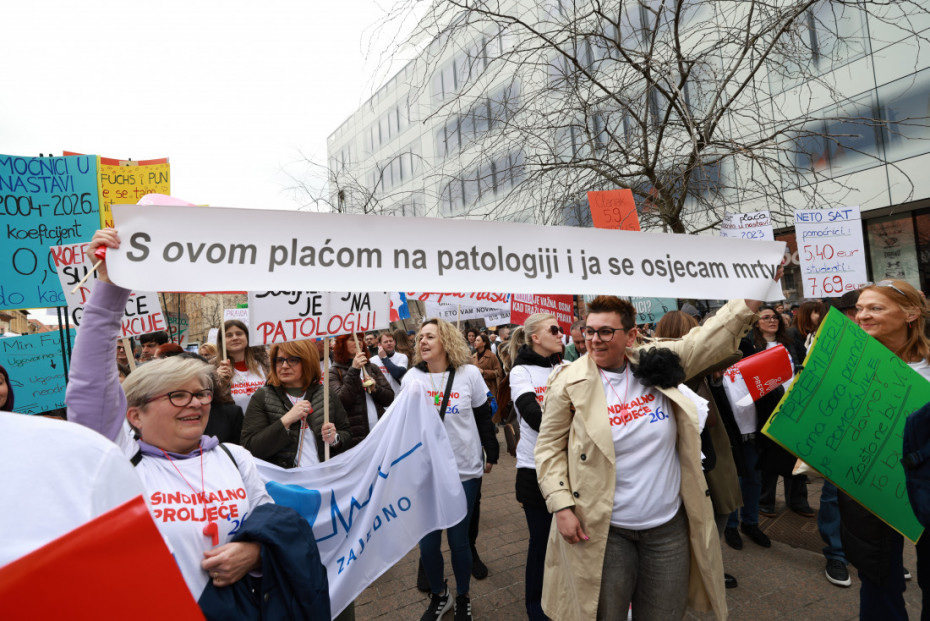 Učesnici protesta nose transparente "Koeficijenti su ispod donje granice detekcije", "Ako smo ključni za zdravlje, budimo ključni i za budžet", "AP, pao si na ispitu iz socijalnog dijaloga", "Da je u školi raditi lako, radio bi svako" i "Dok pravda govori, nepravda urliče", prenosi Hina.