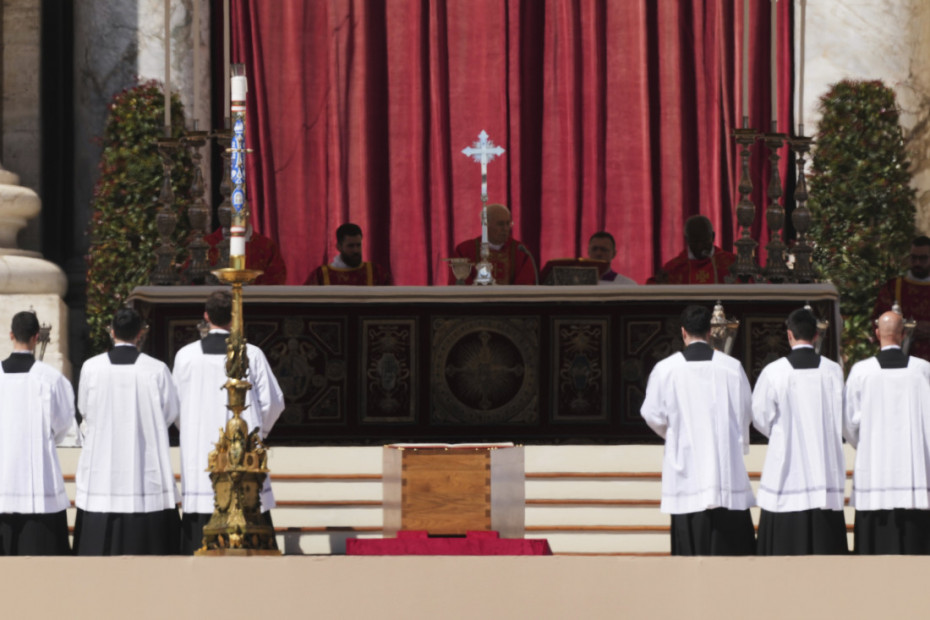 U Vatikanu je u toku pogrebna misa poglavaru Rimokatoličke crkve papa Franji, a trenutno se čitaju Dela apostolska, odnosno ključni deo mise tokom koga se čitaju delovi Starog i Novog zaveta. Ti delovi čitani su na engleskom i španskom jeziku. Misu predvodi kardinal Đovani Batista Re, koji se ujedno i prvi put obraća vernicima na Trgu svetog Petra. Međutim, on neće učestvovati u procesu izbora sledećeg pape, jer ima 91 godinu i smatra se da je prestar da učestvuje u konklavi, na kojoj oni stariji od 80 godina ne mogu da glasaju.