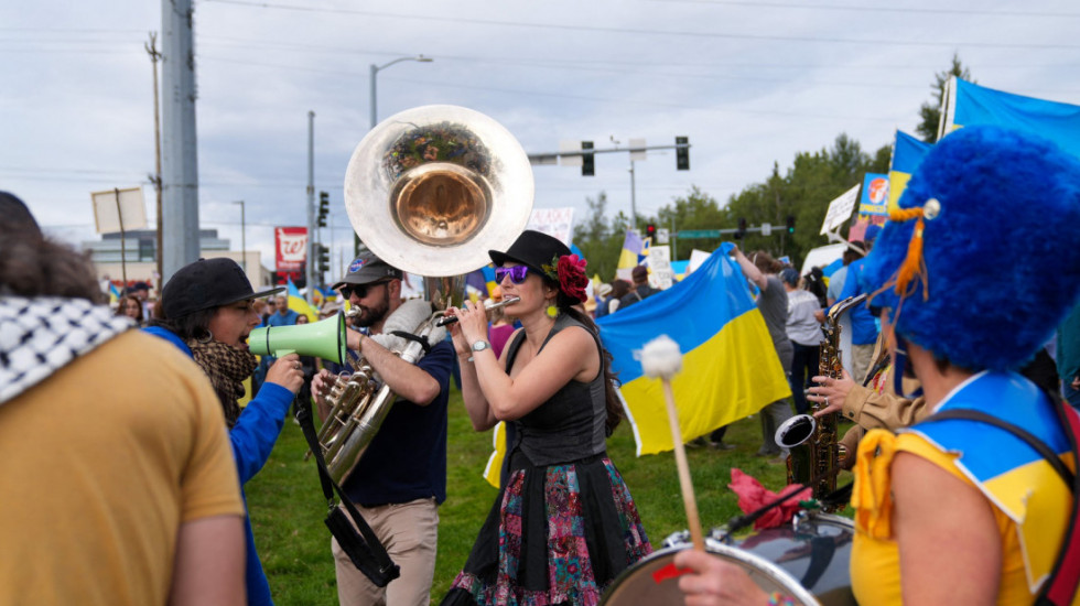 Okupljeni demonstranti, među kojima su bili i stariji i mlađi građani, mahali su ukrajinskim zastavama, nosili transparente sa porukama protiv sastanka Trampa i Putina, ali i protiv drugih Trampovih politika, prenosi danas Enkoridž Dejli Njuz.