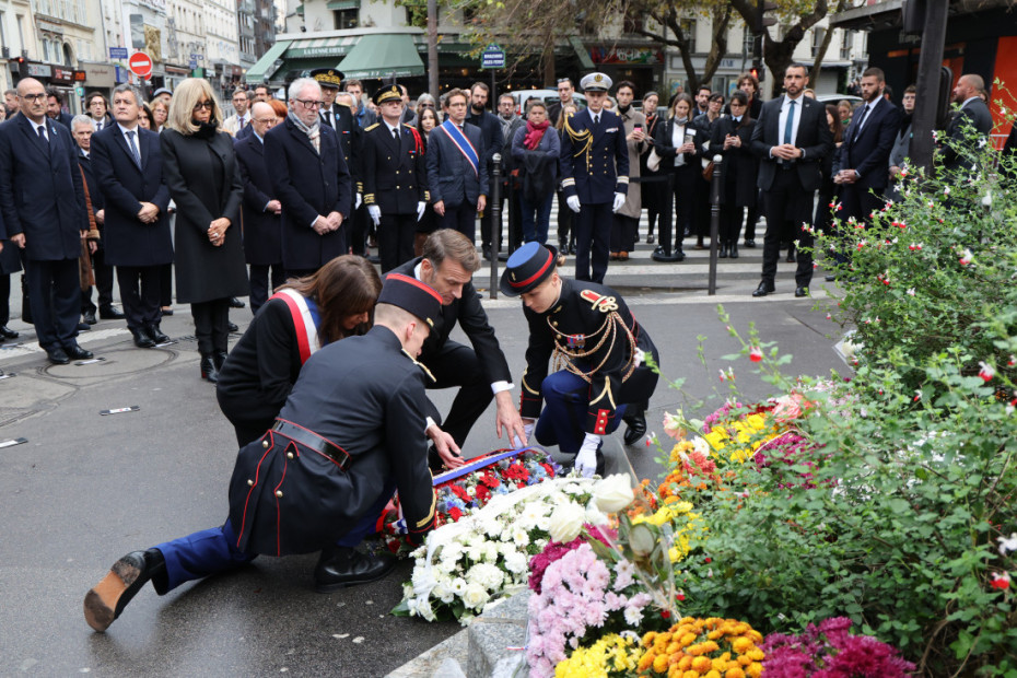 U okviru komemoracije, odata je počast stradalima u napadu u bašti kafića ''Bon bijer'' u 10. arondismanu, a ispred kafea pripadnici udruženja ''Život za Pariz'' položili su venac, nakon čega su isto učinili i Makron i Idalgo.