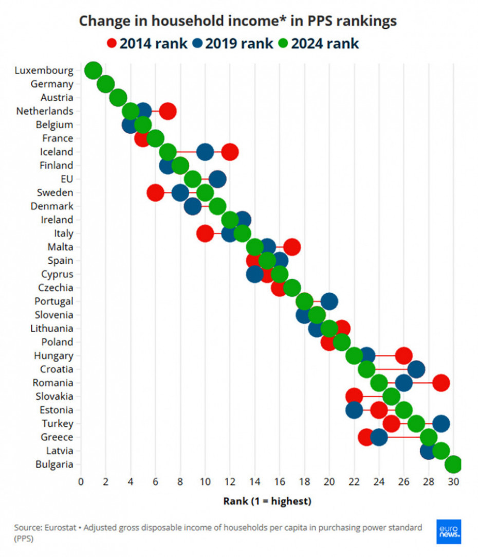 Prema poslednjim dostupnim podacima iz 2024. godine, Luksemburg ima najveći prihod domaćinstva po osobi sa 41.552 PPS među 32 evropske zemlje. Nemačka (37.098), Austrija (34.443), Holandija (34.406) i Švajcarska (33.971) upotpunjuju prvih pet.