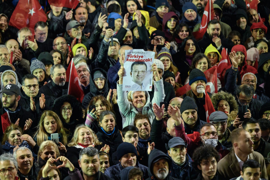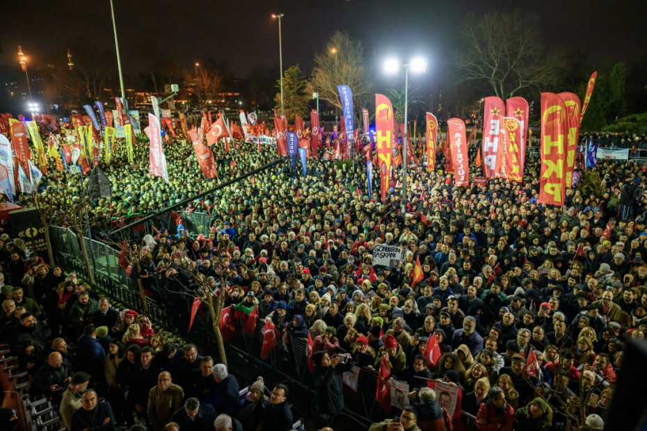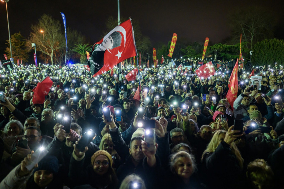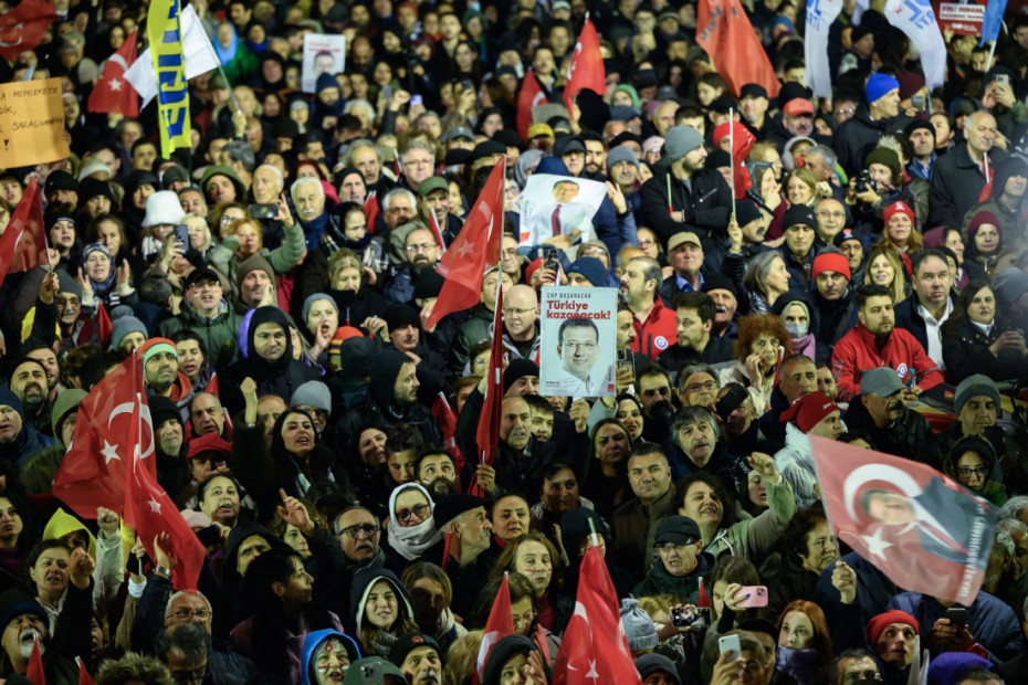Pristalice Imamoglua, koji je smatran glavnim rivalom turskog predsednika Redžepa Tajipa Erdogana, mahale su crvenim stranačkim transparentima i turskim zastavama ispred gradske kuće, na skupu koji je organizovala njegova opoziciona Republikanska narodna partija (CHP).