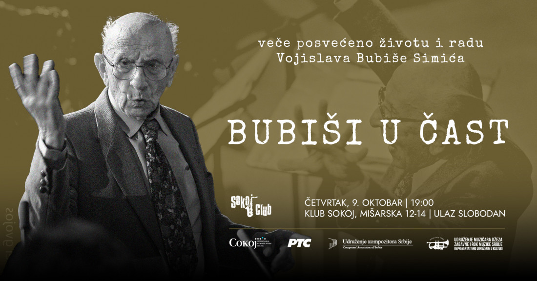 U znak sećanja na jednog od najznačajnijih srpskih muzičara, kompozitora i dirigenata, Vojislava Bubišu Simića, koji nas je zauvek napustio u 102. godini, Sokoj organizuje veče posvećeno njegovom životu i stvaralaštvu "Bubiši u čast".