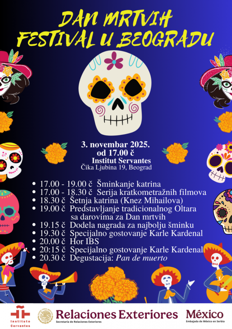 Ceo program u ponedeljak počinje već od 17 časova na platou ispred ulaza u Institut Servantes. Tokom dva sata biće organizovano šminkanje dece i odraslih po uzoru na tradicionalne meksičke katrine, zaštitni znak ovog praznika, koje krasi živopisna šminka i ništa manje šareni kostimi. Za to vreme na velikoj bini biće prikazivana serija kratkometražnih filmova koji će zainteresovane prolaznike upoznati sa bogatom meksičkom tradicijom i kulturom.