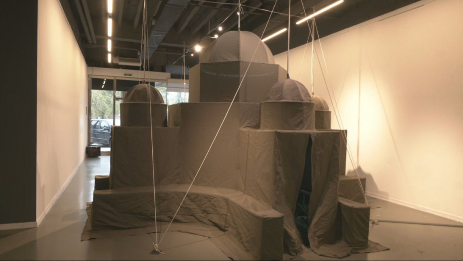 "Onda smo u odnosu na taj rad pokušavali da napravimo jednu harmoničnu ambijentalnu celinu gde će publika moći jako prirodno da se kreće kroz sam prostor. Tako smo odlučili da izložimo još jedan šator 'Dečani M3', koji je inače u vlasništvu Narodnog muzeja u Kragujevcu. Tu je i jedan jako veliki objekat koji se zove 'Šator Vidovdanski hram', koji je nešto najmonumentalnije ovde u ovoj postavci i to su tri rada vezana za taj materijal i uopšte za objekat šator kao neki, u simboličkom smislu, privremeni objekat", objašnjava umetnik za Euronews Srbija.
