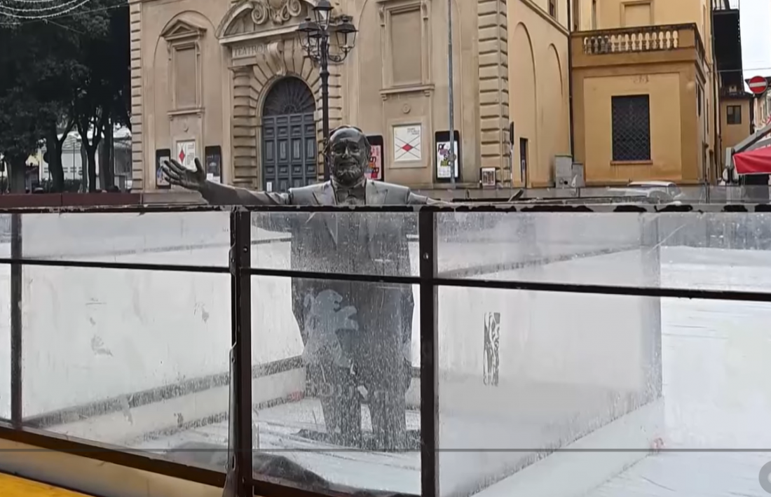 Građani Pezara u Italiji šokirani prizorom na trgu: Statua Lučana Pavarotija kao da izranja iz klizališta (VIDEO)