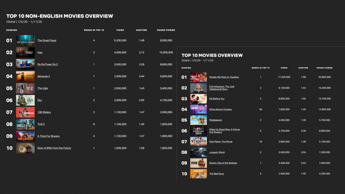 Na vrhu liste našla se "His & Hers", mini triler-serija sa Tesom Tompson i Džonom Bernatalom u glavnim ulogama, koja je debitovala sa 19,9 miliona pregleda. Slede je mini serija Harlanda Kobena "Run Away", koja je u svojoj drugoj nedelji na listi zabeležila 15,6 miliona pregleda, što je rast u odnosu na 12,7 miliona koliko je imala pri debiju prethodne nedelje.