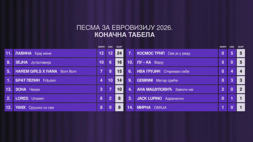 Iako je publika 10 poena, odnosno 14.003 glasova dala Bratu Pelinu, na drugom mestu se ipak našla Zejna.