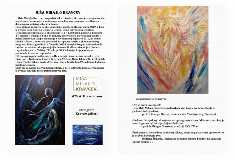 Miša Mihajlo Kravcev, naš poznati slikar i književnik, izlagaće u Novom Sadu od 15. do 25. aprila, u Kulturnoj stanici Eđšeg (Antona Čehova 4).