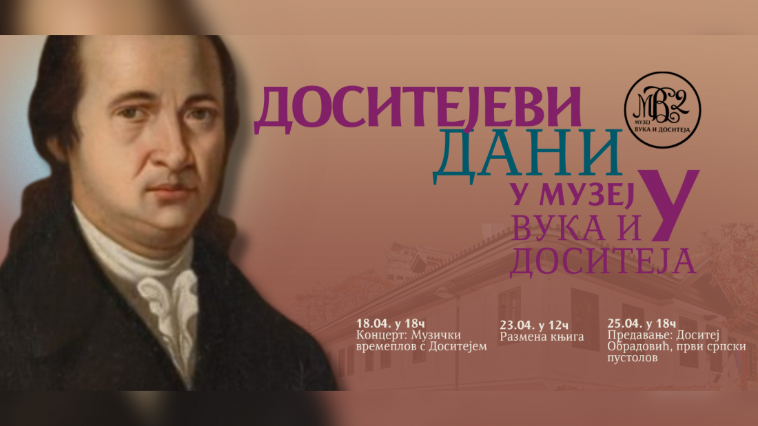 Koncerti, druženja i razmena knjiga, samo su deo muzejskog programa "Dositejevi dani", koji će biti održani od 18. do 25. aprila u Muzeju Vuka i Dositeja, u čast 10. aprila - Dana sećanja na srpskog prosvetitelja.
