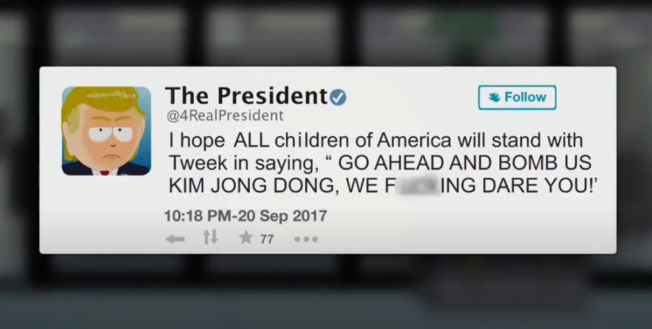 U jednoj od epizoda 21. sezone, tenzije između Amerike i Severne Koreje se razbuktavaju, a predsednik koji je u seriji nekadašnji nastavnik Garison, rizikuje Treći svetski rat agresivnim porukama na društvenim mrežama.