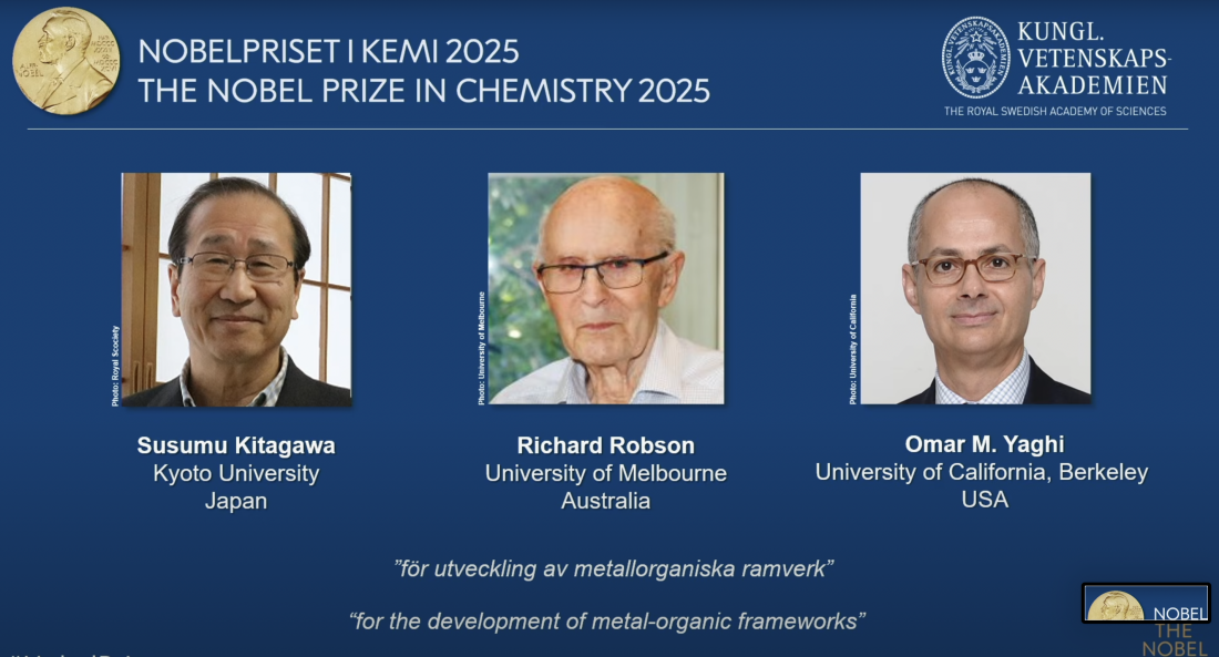 Kraljevska švedska akademija nauka odlučila je da Nobelu nagradu za hemiju za 2025. godinu dodeli Susumuu Kitagavi, Ričardu Robsonu i Omaru M. Jagiju za razvoj metalno-organskih okvira (metal-organic frameworks).