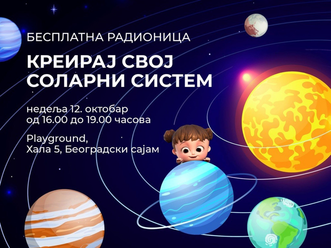 U nedelju, 12. oktobra biće organizovana kreativna radionica "Kreiraj svoj Solarni sistem", tokom koje će učesnici, koristeći različite umetničke tehnike, izraditi svoj model Sunčevog sistema i kući poneti "svoj mali komad svemira", poručuju organizatori.