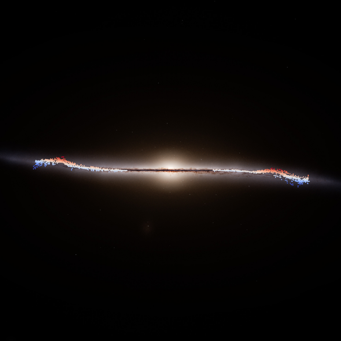 Na levoj slici vidi se pogled odozgo na galaksiju, dok desni panel prikazuje presečeni bočni pogled kroz njen galaktički disk. Iz te perspektive, leva strana galaksije blago se savija nagore, a desna nadole, što je poznato "uvijanje" diska. Crvene i plave oblasti označavaju novootkriveni talas: crvene ukazuju na zvezde iznad savijenog diska, dok plave pokazuju one koje se nalaze ispod njega.