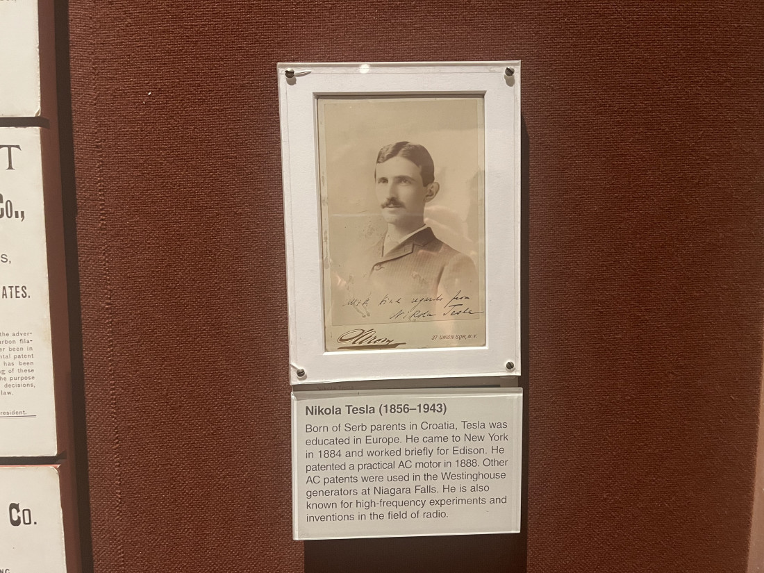 Na izložbi ogromnih i upečatljivih eksponata, postoji fotografija Nikole Tesle iz mladosti, ne veća od pola A4 formata, ispod koje piše "Nikola Tesla (1856 - 1943) čiji su roditelji bili Srbi, rođen u Hrvatskoj.