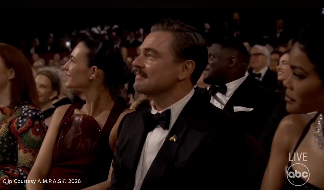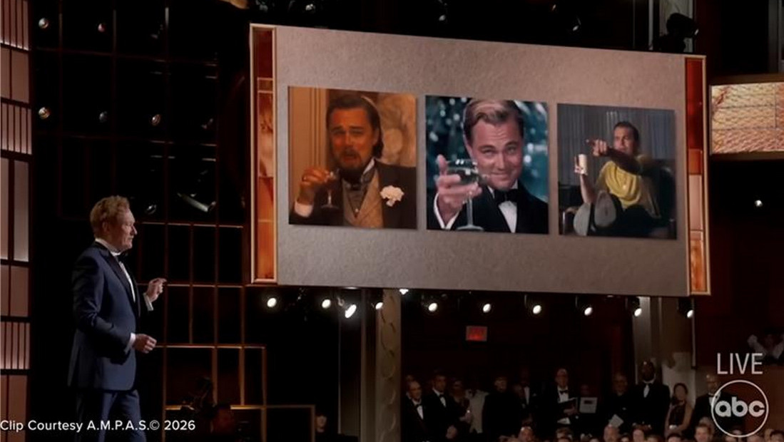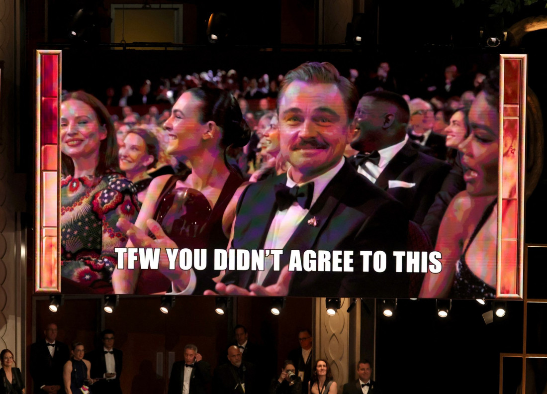 Kamera je zatim prešla na Dikaprija koji je sedeo u publici sa smeškom na licu, a ispod se pojavio natpis: "Onaj osećaj kada se ne slažeš s ovim".