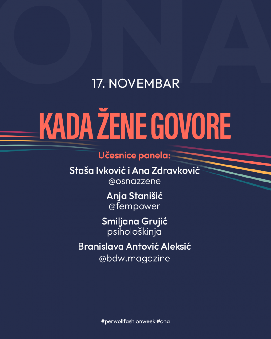 U okviru 56. izdanja Perwoll Fashion Week-a – ONA, biće održan okrugli sto "Kada žene govore", razgovor posvećen položaju žene u savremenom društvu. Učesnice će kroz lična iskustva, profesionalne uvide i međusobni dijalog otvoriti teme koje oblikuju život žene danas.