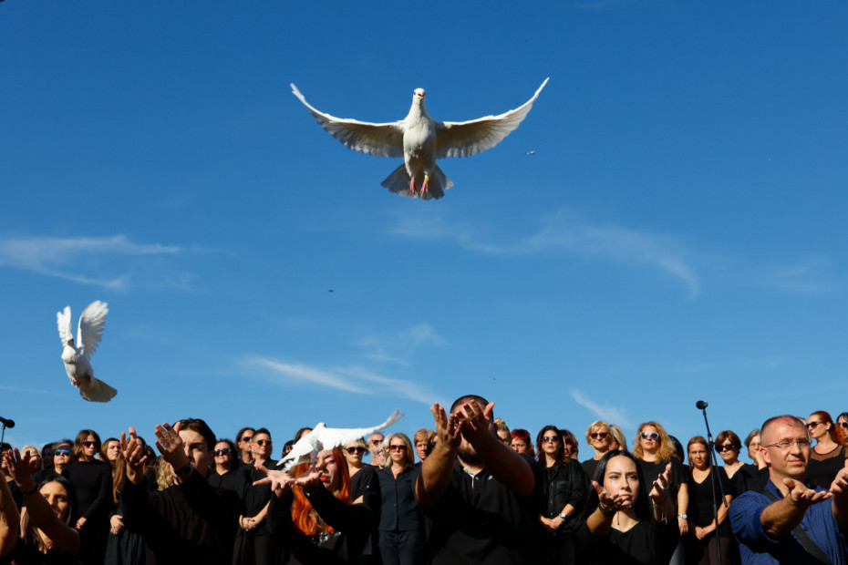 Velika bela golubica deluje kao da bestežinski lebdi iznad grupe ljudi, čije su ruke otvorene dok puštaju ptice u vazduh u Srbiji, 1. novembra. Događaj je održan povodom prve godišnjice pada nadstrešnice na Železničkoj stanici u Novom Sadu – tragedije u kojoj je poginulo 16 ljudi. Komemorativni skup su organizovali mladi koji su ukazivali na navodnu korupciju vlasti, a obuhvatala je i 16 minuta tišine u znak sećanja na žrtve, piše BBC.