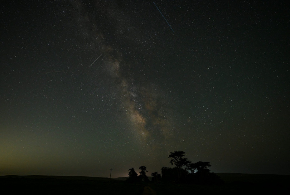 Fotografija koja beleži meteorsku kišu Eta Akvarida dok se razbija kroz noćno nebo iznad Invernesa u Kaliforniji u ranim satima 6. maja. Nadmašena svetlucavim zamagljenim sjajem Mlečnog puta iznad nje, svetlo malog sela deluje tek kao treptajuća fusnota u ogromnoj kosmičkoj drami.