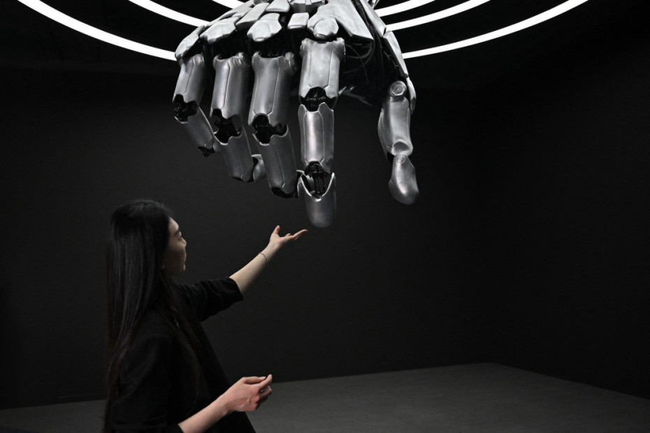 Fotografija mlade žene koja pruža ruku da dotakne polako otvarajući kažiprst ogromne robotske ruke snimljena je tokom novinarske ture u World of Robots u Pekingu u aprilu.