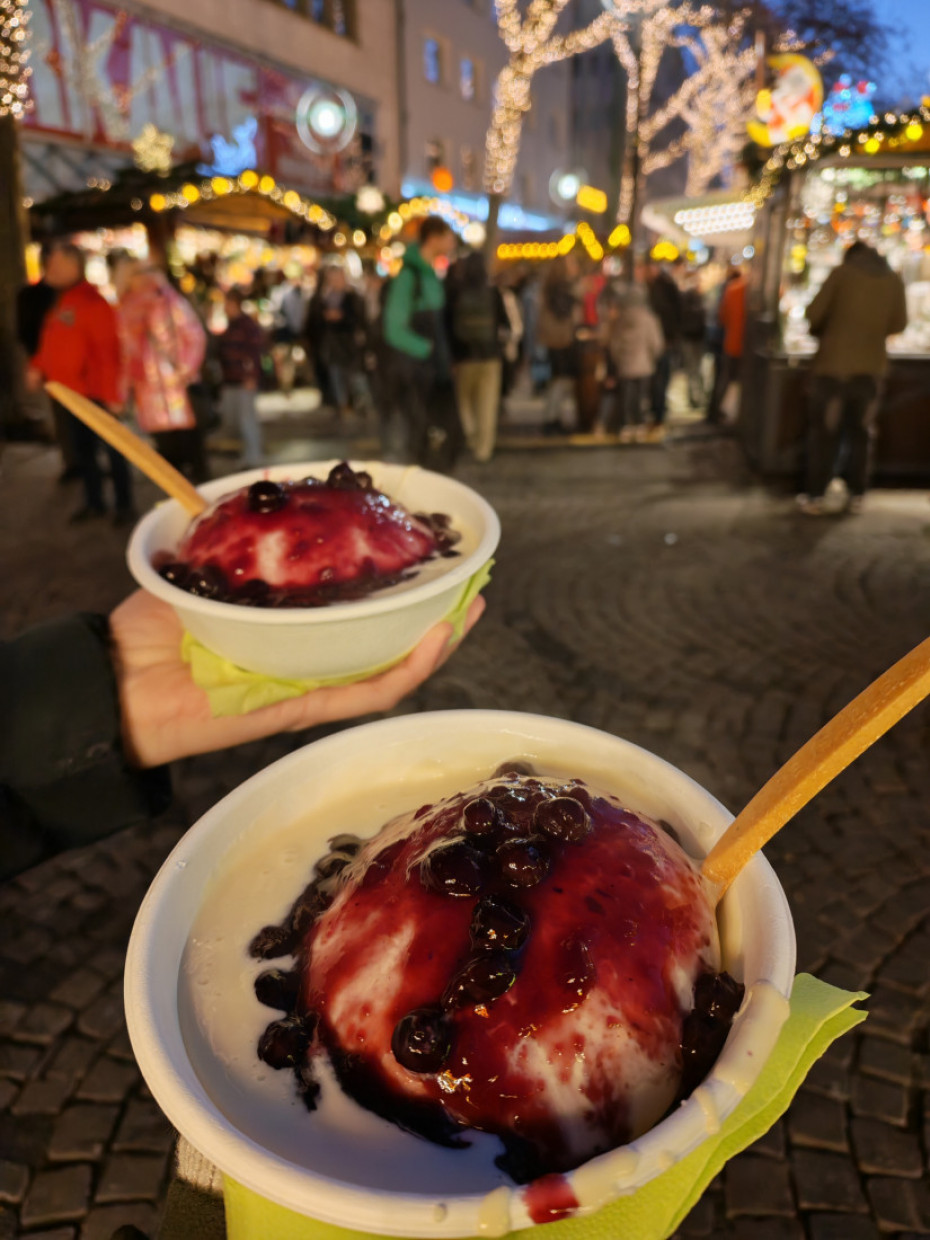 Market se prostire na više trgova u centru grada i nudi bogat izbor tradicionalne nemačke hrane i pića - od bratvurst kobasica do fantastičnih germknedli. Kuvano vino ovde možete popiti za 3,5 evra, a ukoliko uz njega zadržite i prazničnu keramičku šolju iz koje ste pili, to će vas koštati 7 evra. Kobasice takođe u proseku koštaju 7 evra, kao i germknedle.