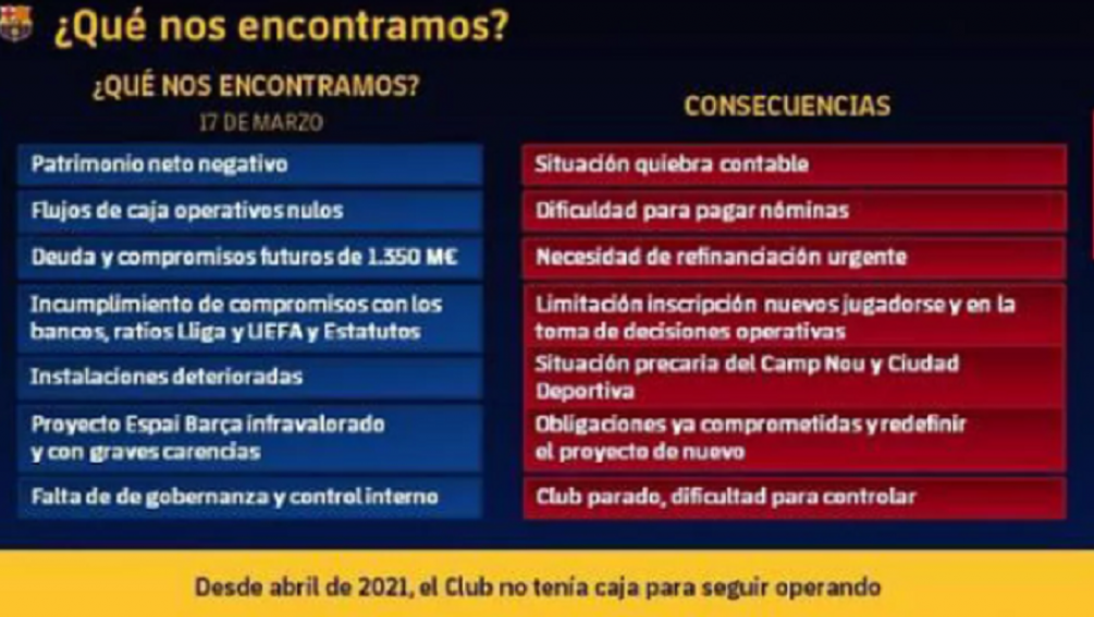 Bivši opredsednik Hoze Marija Bartomeu je znao da ne može da plati preskupe ugovore, podizao je kredite (85 miliona evra) samo da bi pokrio troškove plata i brzo je sa 159 miliona duga otišao na 673 miliona a da Skupštini to nije preneto i prezentovano.