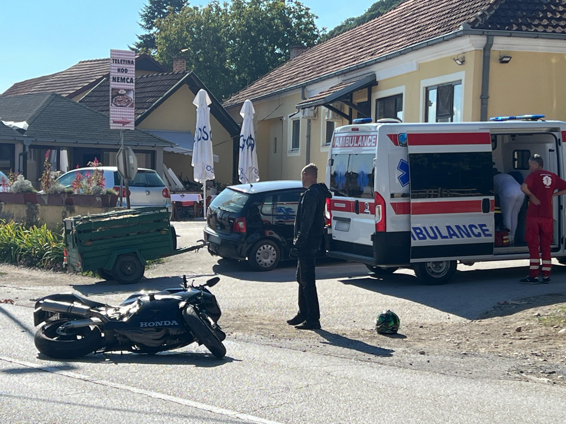 Vozač motocikla i njegova saputnica zadoboli su lakše telesne povrede prilikom pada, dok je na automobilu pričinjena materijalna šteta.