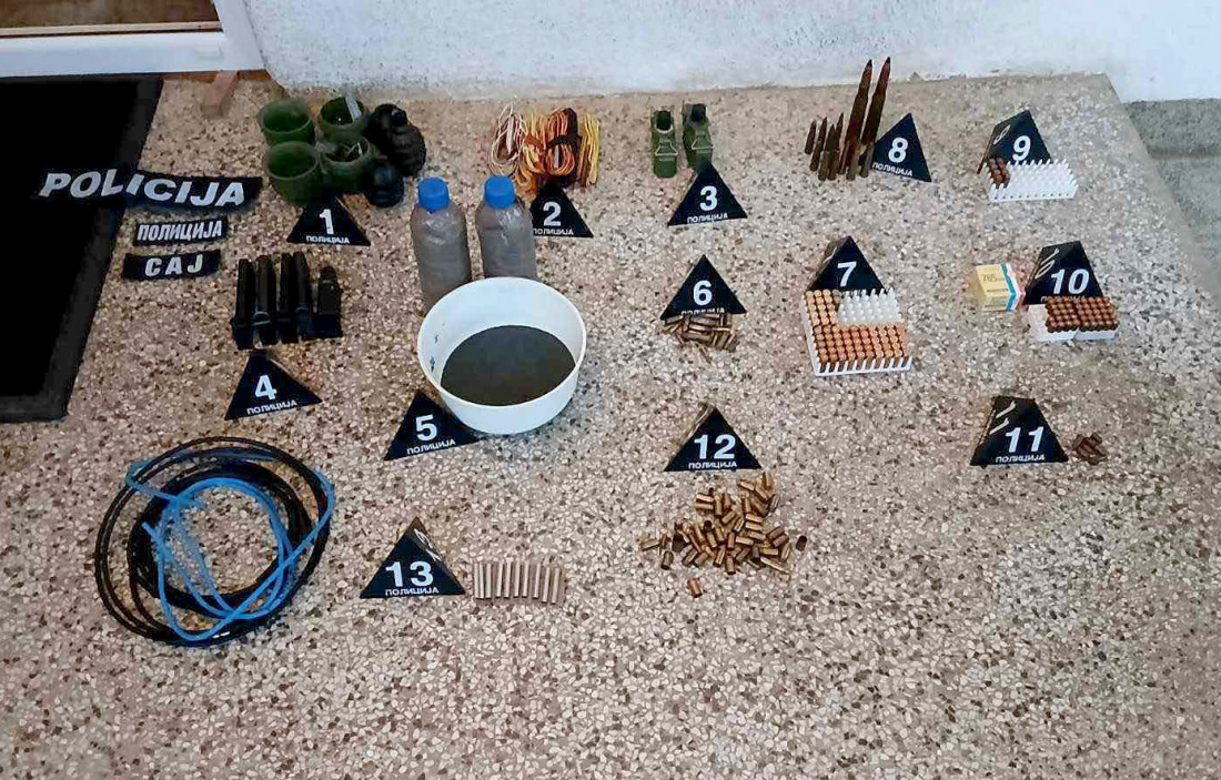 Iz MUP-a su istakli da su tom prilikom oduzete dve ručne bombe, dve kutije za ručne bombe, jedna mačeta, 5 pištoljskih okvira, više od 200 komada pištoljske i puščane municije različitog kalibra, 10 komada čaura, elektronske kapisle, dva mobilna telefona, tri policijske oznake, službena legitimacija MUP-a, dva para službenih lisica, jedna gas maska, beretka sa srpskim grbom i više komada vojne garderobe.