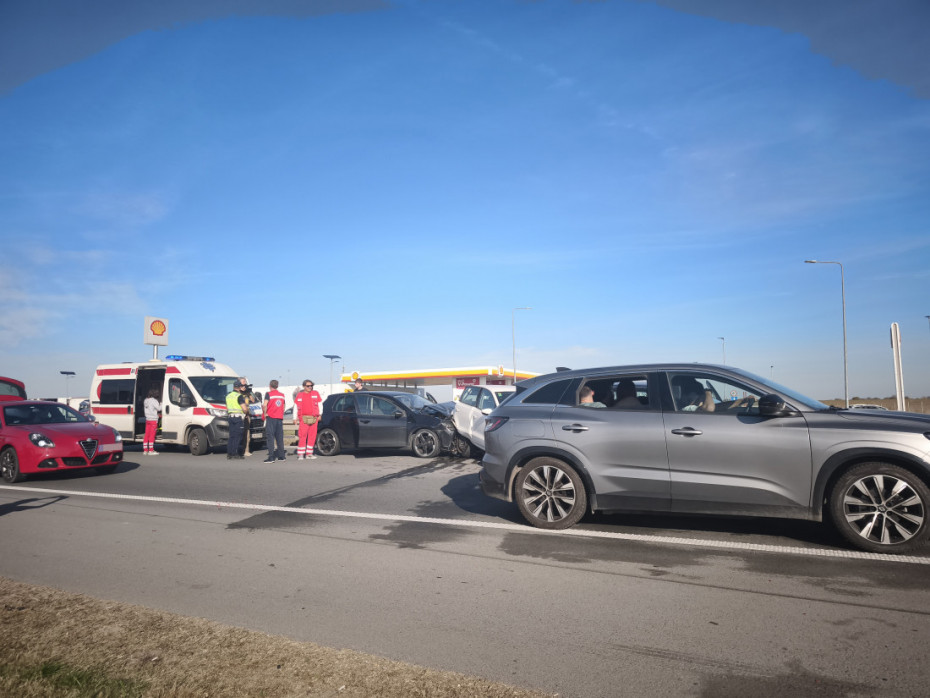 Saobraćaj se odvija desnom i zaustavnom trakom. Na terenu su Hitna pomoć i policija.