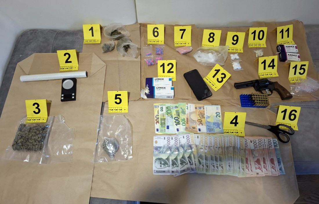 Pretresom stana i drugih prostorija na Paliluli koje koristi osumnjičeni, policija je pronašla određenu količinu više vrsta opojnih droga - kokain, MDMA, marihuanu i drugo, kao i pištolj, 33 komada municije i novac.