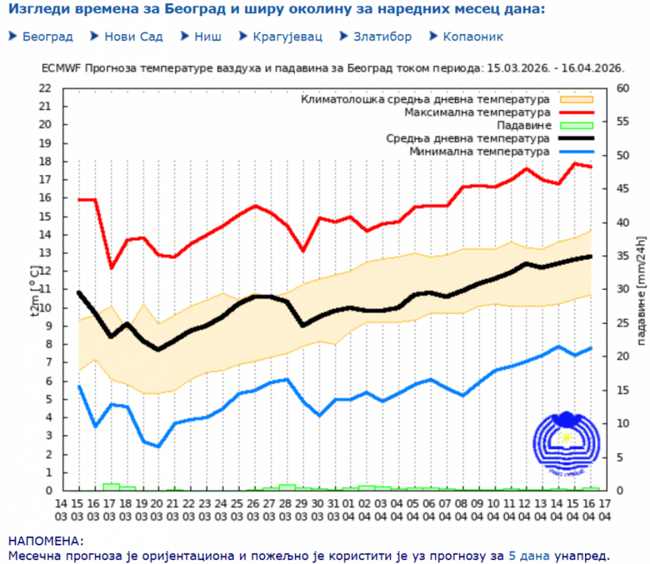 Za ostatak marta prognoza predviđa umereno oblačno vreme sa sunčanim intervalima, uz dnevne temperature između 12 i 17 stepeni, što će doneti pravo prolećno vreme.