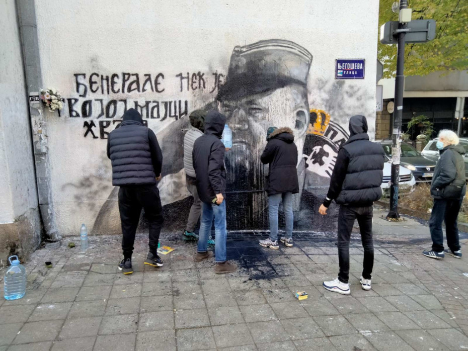 Nakon što je nepoznata osoba ponovo danas bacila crnu farbu na mural Ratku Mladiću na uglu Njegoševe i ulice Alekse Nenadovića u Beogradu, grupa mladića ponovo je došla kako bi ga očistila.