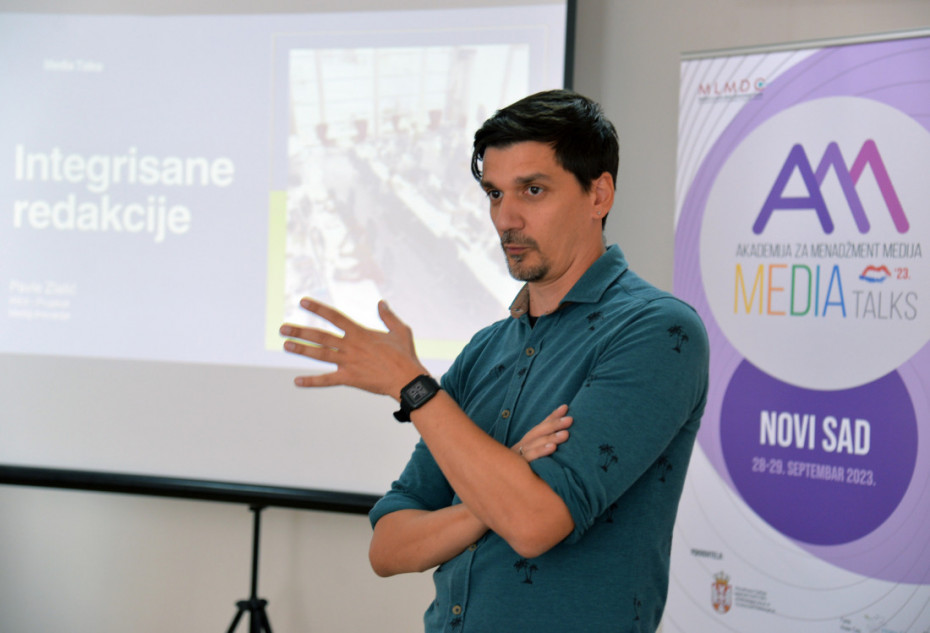 Integrisane redakcije: Pavle Zlatić, stručnjak za digitalne medije sa više od 20 godina iskustva u industriji vesti, trenutno radi za IREX Srbija kao Senior Lead za digitalni razvoj na projektu Mediji. Inovacije vodio je ovu sesiju, pružajući učesnicima uvid u prednosti i izazove integrisanih redakcija u savremenom medijskom okruženju, ističući njihovu važnost za efikasniji rad u promenljivom medijskom pejzažu. Naglasak je na promeni redakcijske kulture i potrebi novinara da budu višestruko veštiji u radu sa različitim medijima.