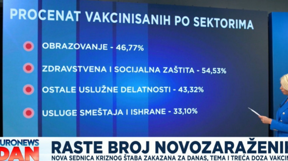 U sektoru obrazovanja do sada je vakcinisano 46,77 odsto. Preko pedeset odsto vakcinisanih je u sektoru socijlne zaštite i tu je svoju dozu primilo 54,53 odsto. U ostalim uslužnim deltanostima vakcinisano je 43,32 odsto a u uslugama smeštaja i ishrane 33,10 odsto.