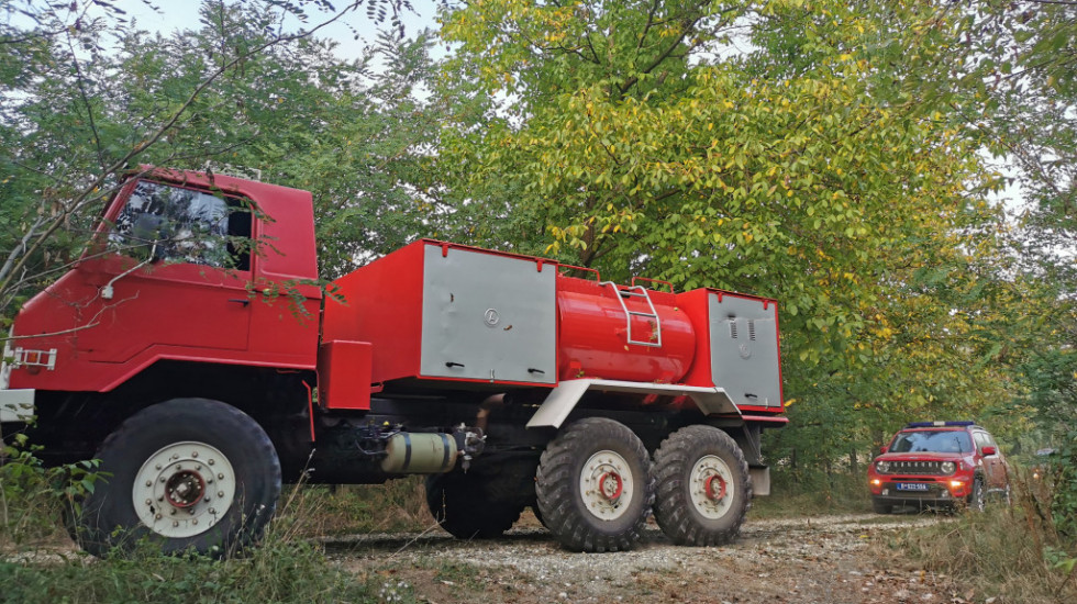 Na licu mesta su dva vatrogasna vozila, a ekipe vatrogasca se na nepristupačnom terenu bore da ugase plamen.