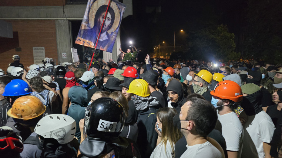 Većina okupljenih ima hirurške maske preko lica, naočari za ronjenje, marame i zaštitnu opremu.